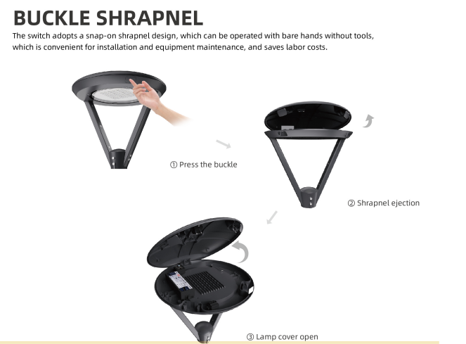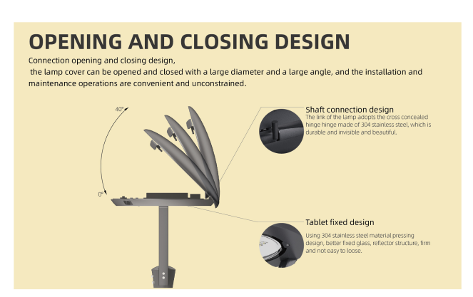 कनेक्शन खोलने और बंद करने का डिज़ाइन, दीपक कवर को बड़े कोण से खोला और बंद किया जा सकता है,
