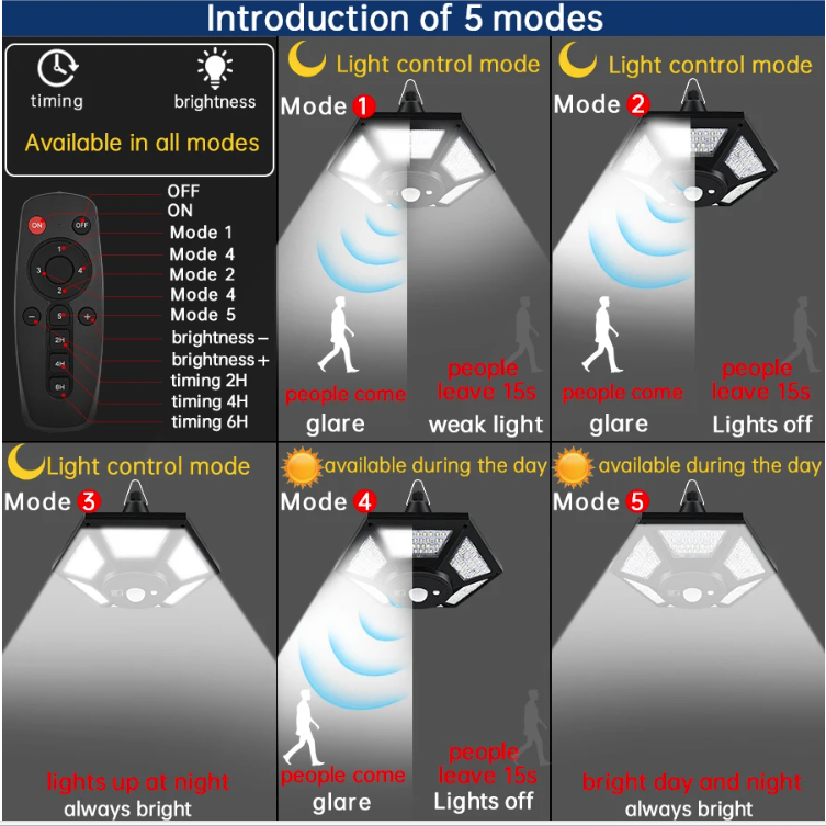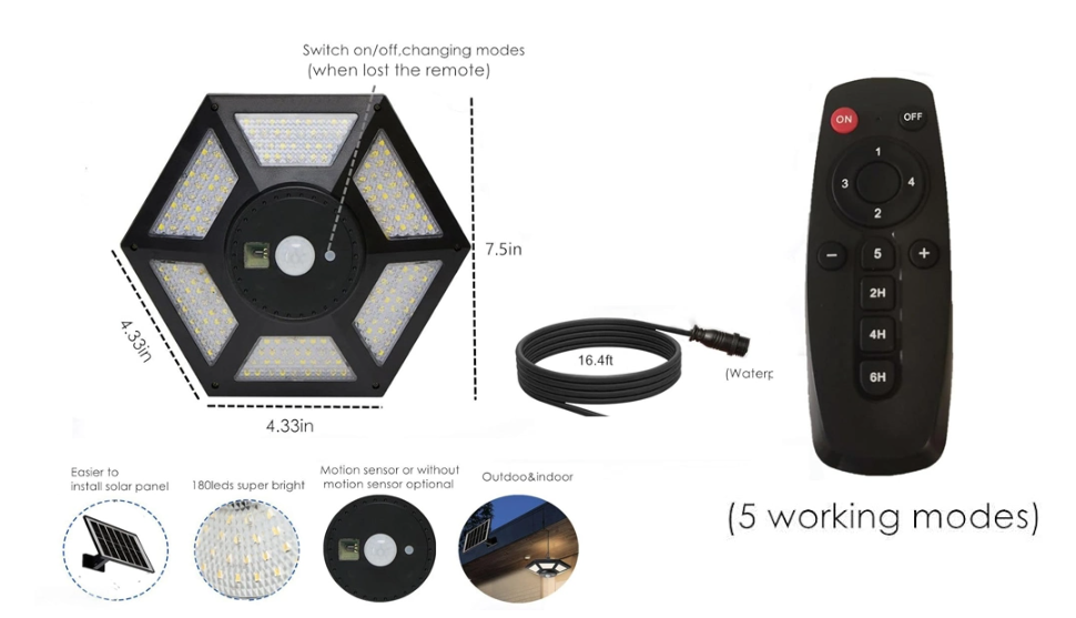 रिमोट कंट्रोल: प्रकाश के नीचे 9.8-16.4 फीट, सेंसर कोण: 360 डिग्री, IP65 जलरोधक स्तर।