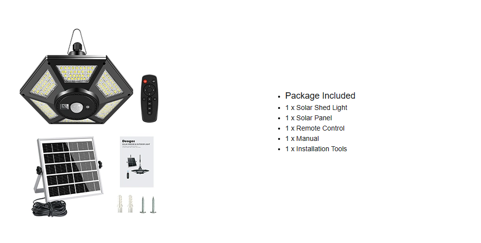 | शामिल घटक | सौर पैनल, रिमोट कंट्रोल, माउंटिंग हार्डवेयर, लाइट फिक्सचर |